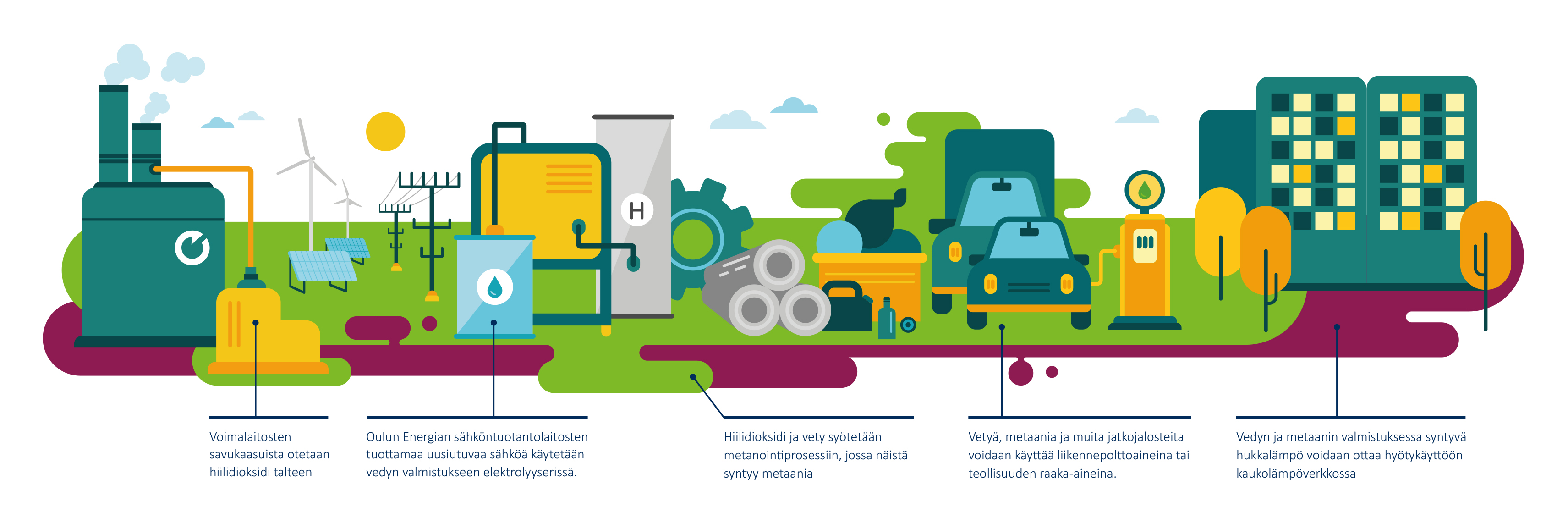 Uudet ratkaisut edellyttävät teknologiaa, Oulun Energian hahmottelemassa ratkaisussa tarvittaisiin esimerkiksi hiilidioksidin talteenottolaitteisto ja vedyn valmistuslaitteisto – Kantolan mukaan todennäköisesti elektrolyyseri. Lisäksi tarvitaan vedyn ja hiilidioksidin jatkojalostuslaitteisto. Esimerkiksi metaanin valmistuksessa tarvitaan metonointitekniikka, joka yhdistää hiilidioksidin ja vedyn – riippuen siitä, mitä lopputuotetta ollaan valmistamassa.