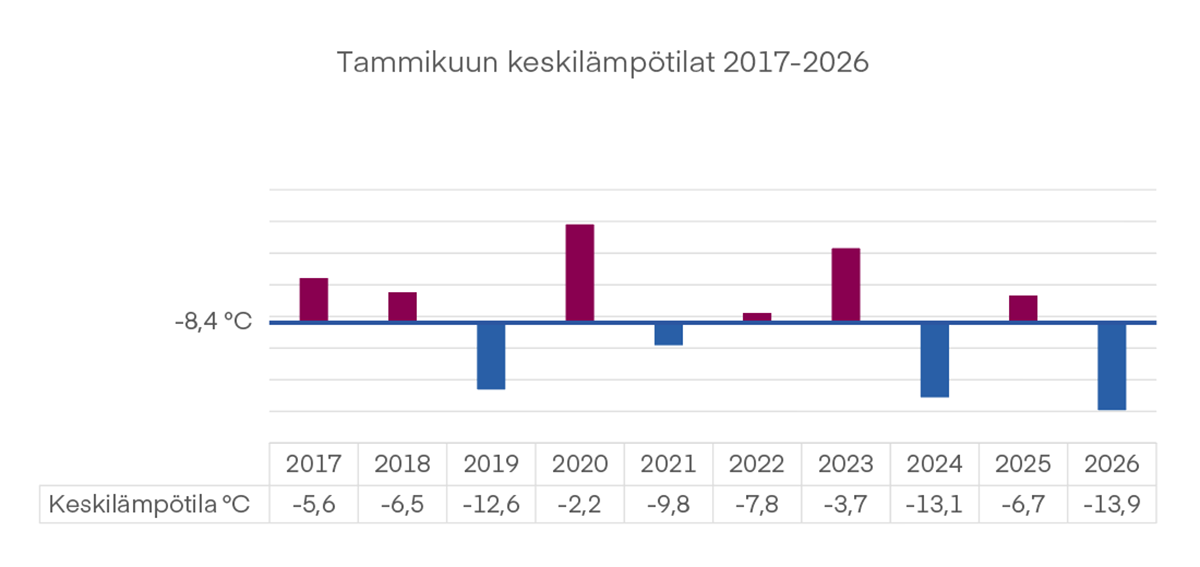 Tammikuun pitkän aikavälin (1991–2020) keskilämpötila Oulussa on –8,4 °C. Tähän arvoon verrattuna vuodet 2019, 2024 ja 2026 ovat olleet selvästi keskiarvoa kylmempiä. Sen sijaan vuodet 2020 ja 2023 ovat erottuneet tavanomaista leudompina tammikuina. (Lähde: Ilmatieteenlaitos)